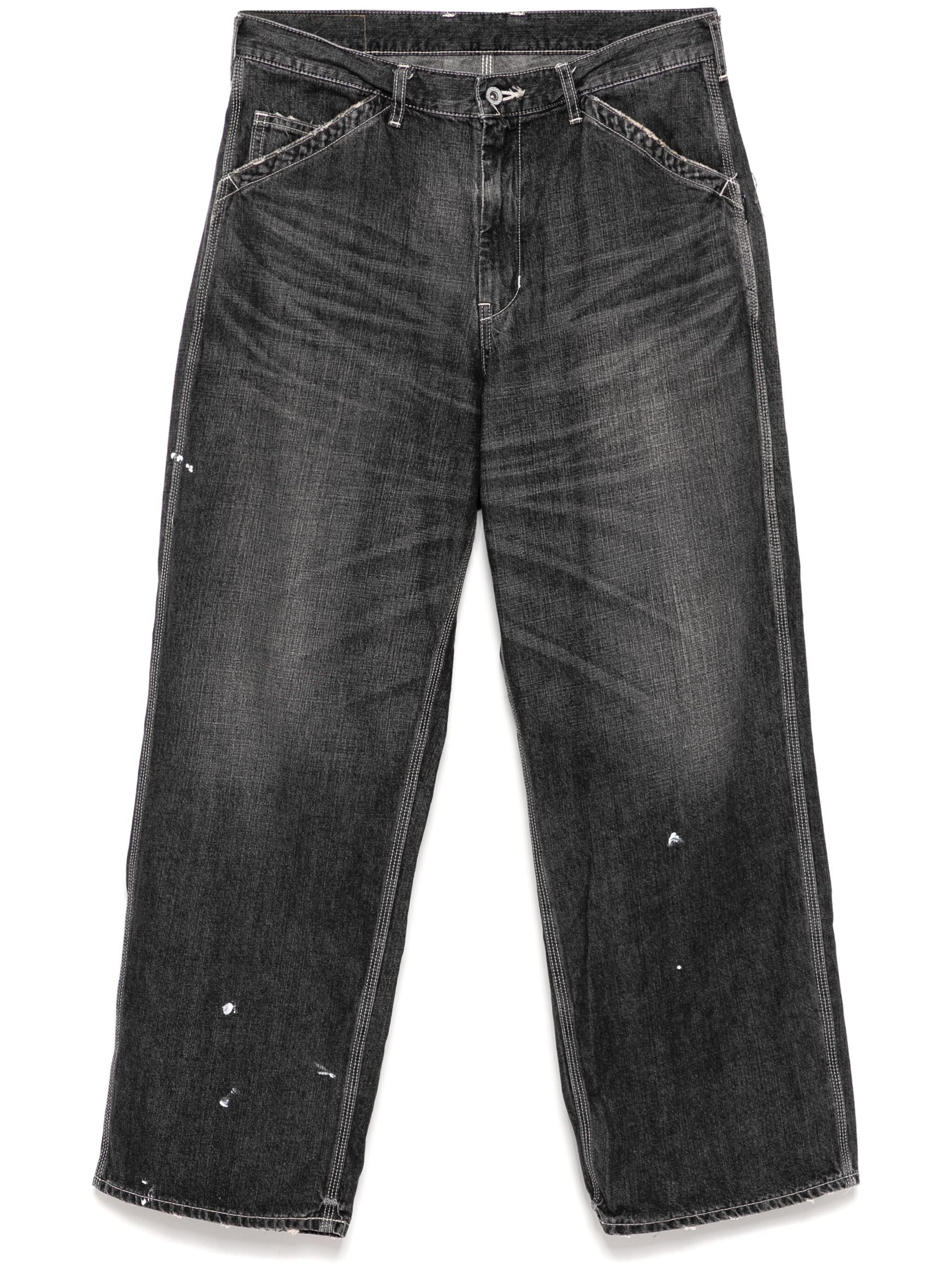 Expertly crafted from premium black cotton, these Wide-Leg Jeans feature a concealed zip-fly and button fastening for a sleek silhouette. The contrasting stitching, whiskering effect, and spray-paint design add a touch of urban flair. Complete with belt loops, five classic pockets, and an embroidered logo for a timeless finish. Perfect for any occasion, these jeans offer a full-length wide leg for comfort and style.