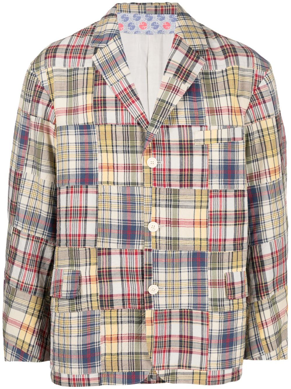 Yardbird patchwork jacket from visvim featuring multicolour, linen-wool blend, patchwork design, check print, notched collar, front button fastening, long sleeves, chest welt pocket and two front flap pockets.
