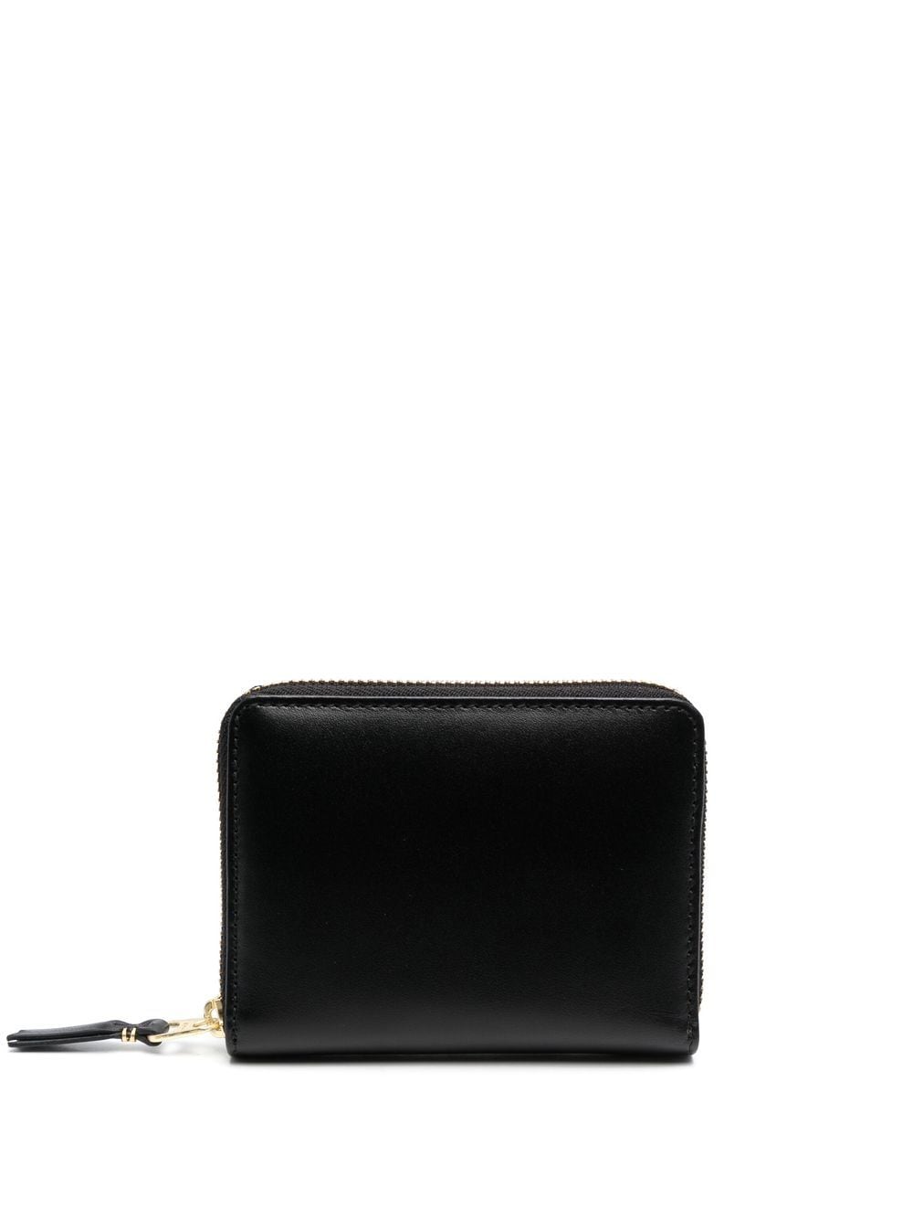 zip-up leather wallet from COMME DES GARÇONS WALLET featuring black, calf leather, all-around zip fastening, internal card slots, internal logo stamp and coin pocket.